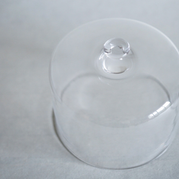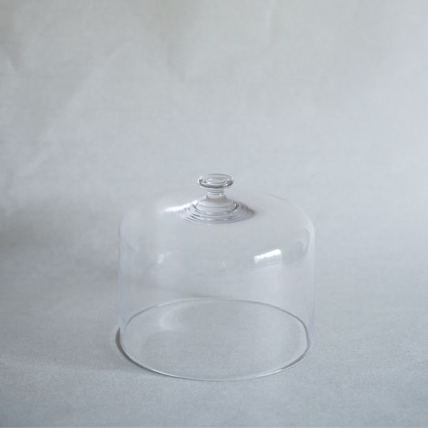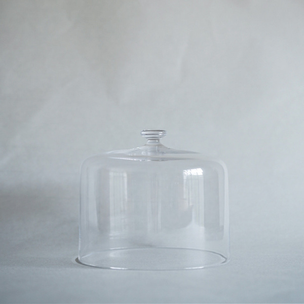 無色透明の硝子が中に入れたものを色鮮やかに美しく見せてくれます。 5号サイズ(直径15cm)のホールケーキが程よく収まります。またドライフラワーや貝殻など自然物などを収めてオブジェとしてお使いいただいても素敵です。