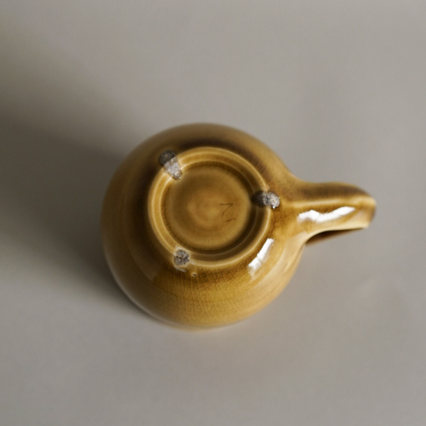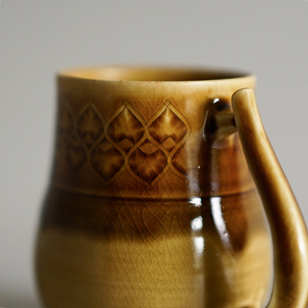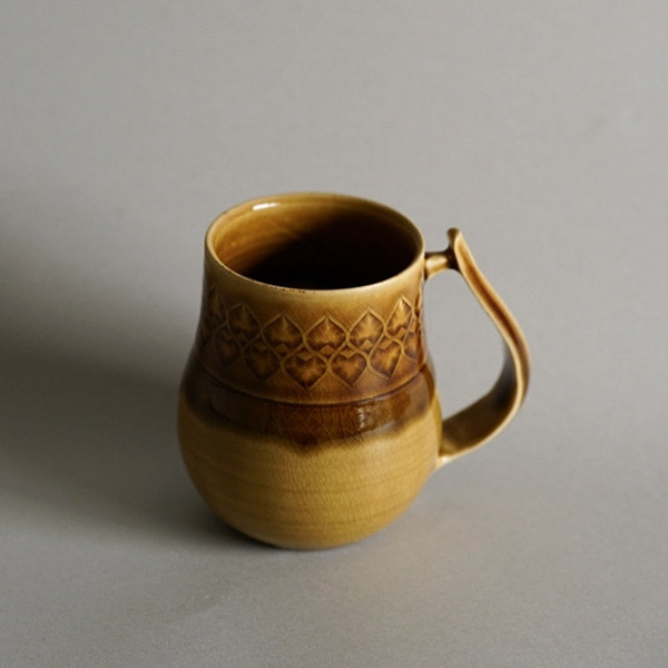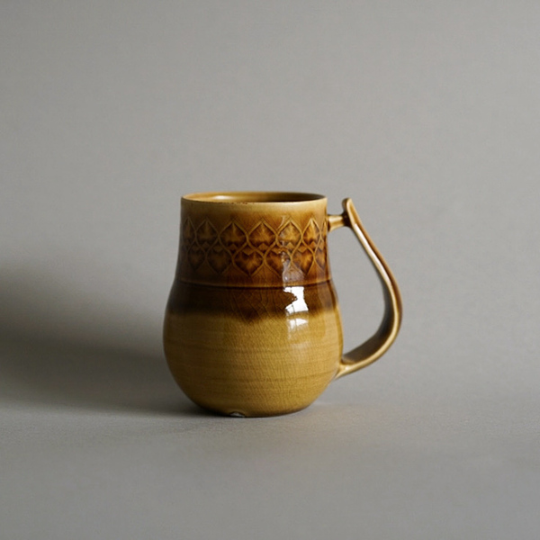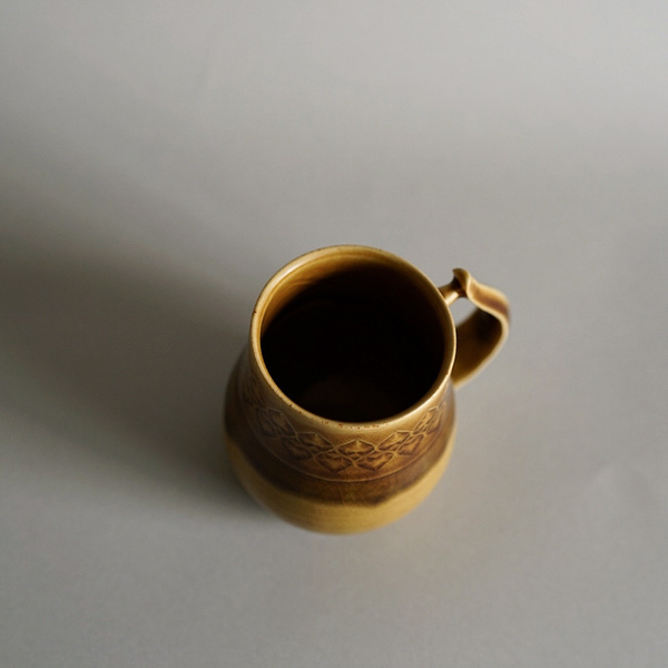 深みのある黄色と茶色の釉薬が掛け分けられています。上部には美しい彫模様が施されています。