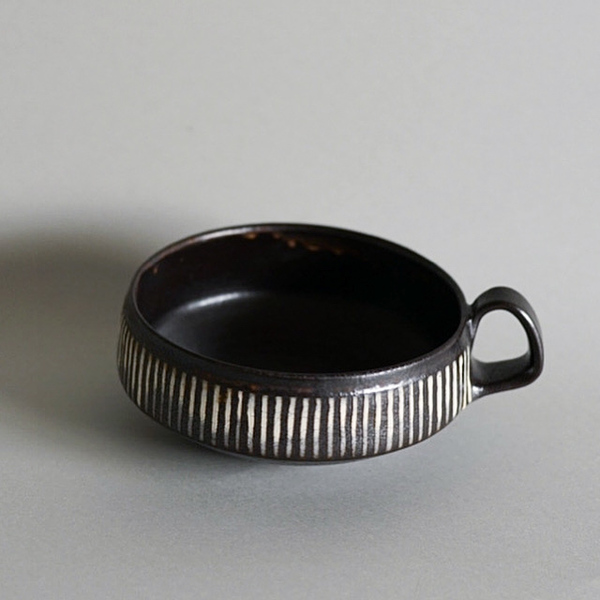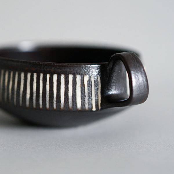 端正でスタイリッシュな雰囲気のモノトーン作品。白化粧土を埋め込む「象嵌」という技法で十草模様(細い線模様)が施されています。和洋中問わずお料理の映える器です。