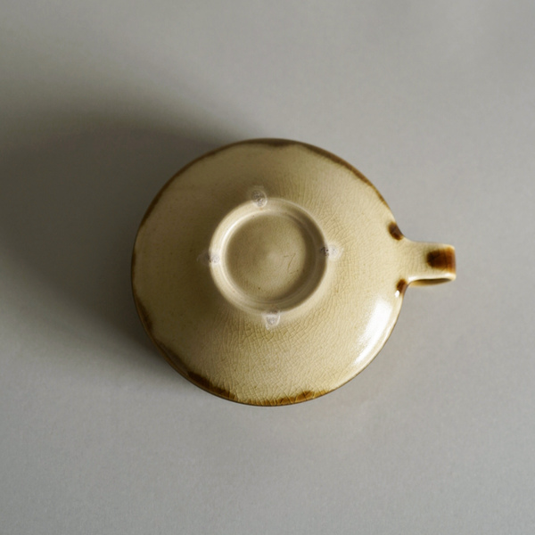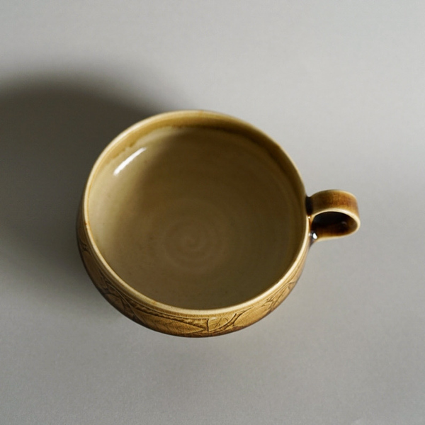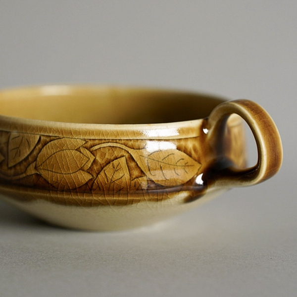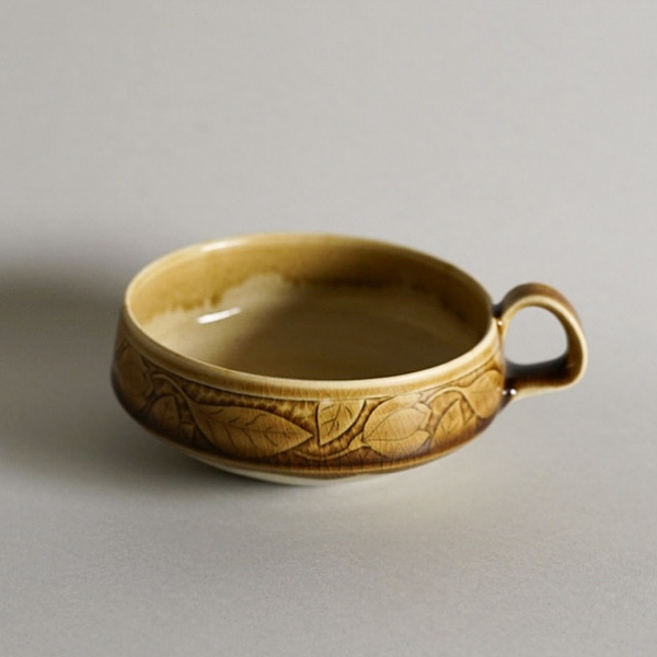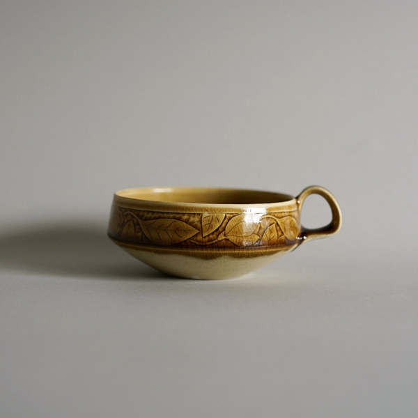 薄黄色の釉薬をベースに、上部には草花の彫り模様が施され、茶の釉薬が掛けられてあります。 美しい紋様と釉薬の自然なグラデーションが調和し、落ち着いた佇まい。どこかアンティークの器のような趣もあり、スープやシチュー、冷たいデザートを入れても似合いそうです。