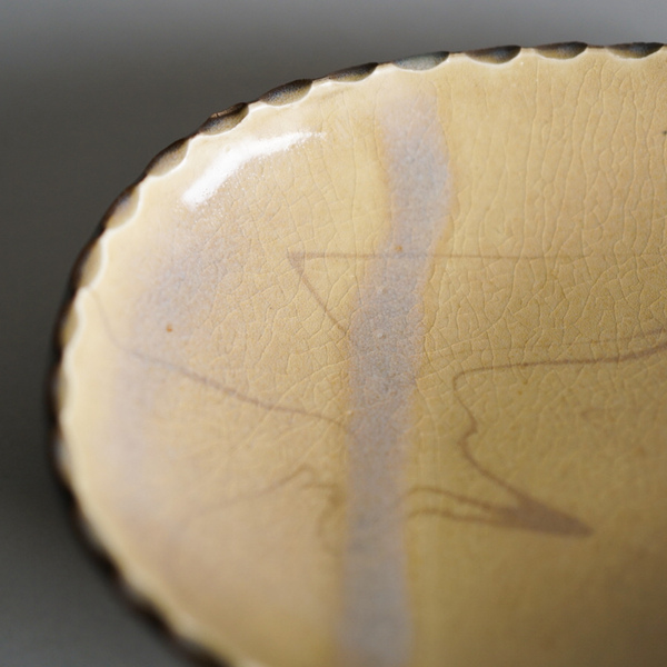 素地に泥漿(でいしょう)と呼ばれる液状の化粧土をかけ、櫛や筆などで文様を描き出す「スリップウェア」という技法でつくられた器です。同じ文様であっても、描き方や釉薬の流れによって表情はひとつひとつ異なり、手仕事ならではの面白さが感じられます。 こちらは、クリーム色の地にベージュの文様、薄灰色に変化した釉薬の流れが美しい作品。どこかモダンで、少し異国の空気を思わせる佇まいです。