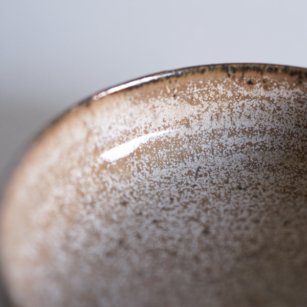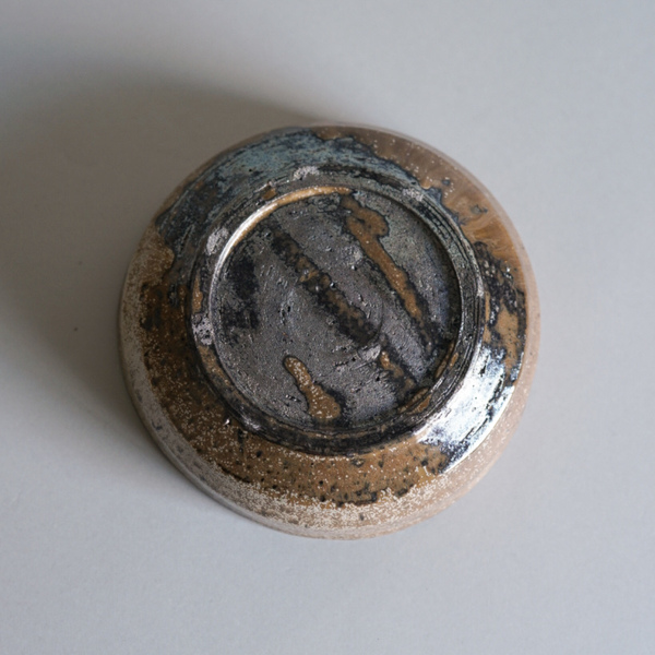 薪窯で焼かれた作品。深みのあるピンクベージュと白がにじむように重なり、炎の痕跡が複雑で深みのある景色を生み出しています。緩やかな円を描くフォルムには、かちっとしていない伸びやかで自然な美しさがあります。