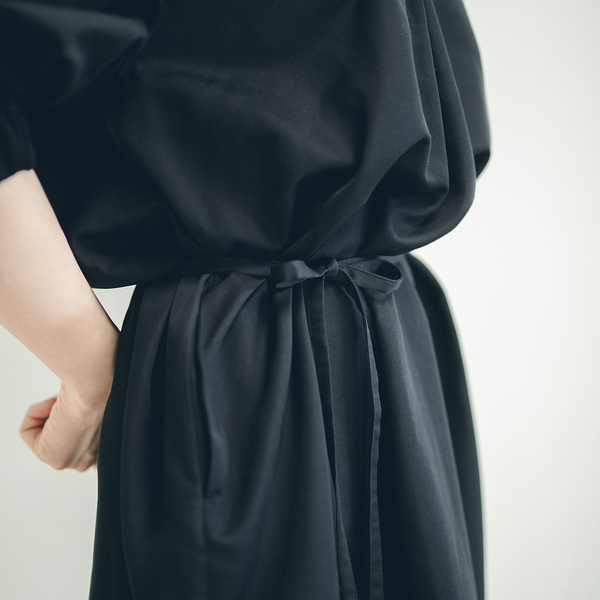 共布で作られた腰紐は、気分でつけたり外したり。一枚でさらりと着るのはもちろん、冬場にはタートルネックを重ねても。季節を問わず、長く装いを楽しんでいただける一着です。