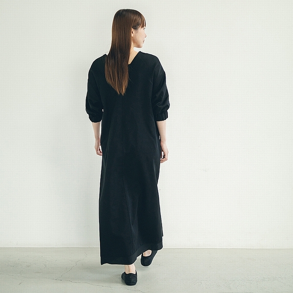 Vラインの縁には、裁ち切りで仕上げた細やかな襟を重ね、裾には透け感のあるシルクデシンを組み合わせています。緩やかに広がるAラインのシルエットは、動きに合わせて軽やかな影を生み、身体の輪郭をほどよく柔らかく整えてくれます。