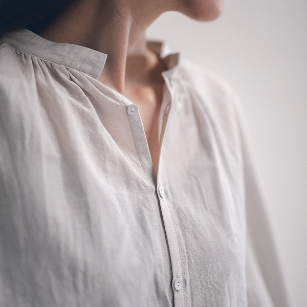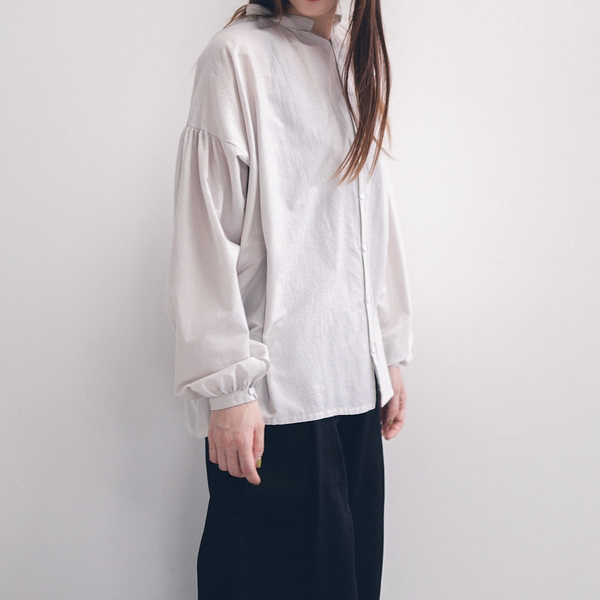 襟元と袖口に施したたっぷりのギャザーが、動きに合わせて表情を生み、ブラウスにほどよい甘さを添えています。首元から袖へと繋がるドロップショルダー。貝ボタンを白くペイントした袖口のボタン。随所にユーモレスクらしい控えめなこだわりが感じられます。フロントボタンを留めて一枚で。またボタンを開けて羽織として纏っても。素材の美しさと柔らかなフォルムが調和した品のある一着です。