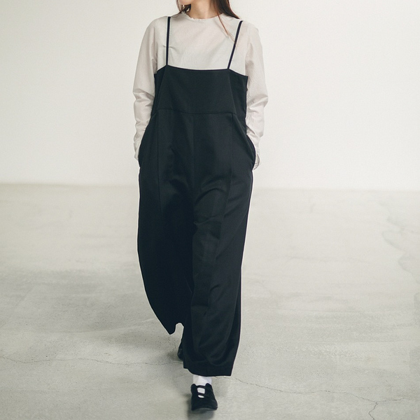 インナー次第で季節を問わず長く楽しめる一着。上質感と大人の可愛さを両立させたサロペットです。