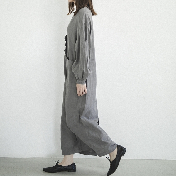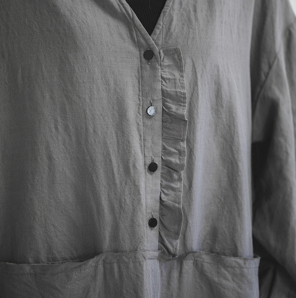 すっきりとしたVネックの下にはオリジナルの小さなボタンが並び、片側にあしらわれたフリルが大人の可愛さを感じさせてくれます。ウエストの切替ラインには、そっと隠れるように2つのポケットが。細部にまでさりげないこだわりの感じられる一着です。